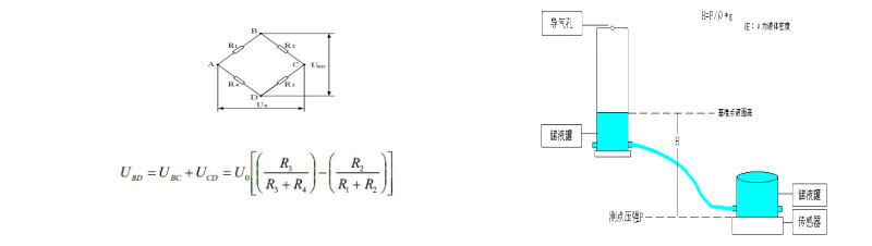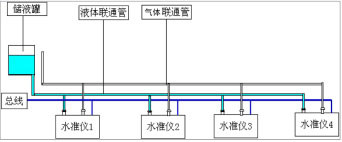 工作原理:各沉降監(jiān)測點安裝壓阻式靜力水準儀,并需要在一相對不動點安裝基準罐。傳感器之間通過高強度的氣壓管聯(lián)接一起匯入到基準罐,每個水準儀內(nèi)部都安裝有高精硅壓傳感器,在基準罐與傳感器之間充滿液體介質(zhì),水準儀內(nèi)的壓力傳感器感測到的是該點到基準罐液體表面的壓力,該壓力與液面高度有一定線性關(guān)系。如果壓力傳感器感測到壓力發(fā)生變化即說明該點與基準液面之間的高差發(fā)生變化,根據(jù)出廠前的壓力變化量與液面高差的標定線性表,靜力水準儀內(nèi)部的單片機可以計算出高差變化值。根H=P/ρ*g計算出從測點到基準點液面到傳感器高度。原理示意圖如下: